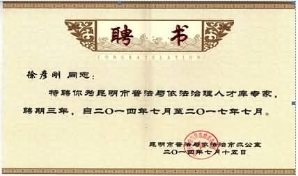 昆明市普法与依法治市办公室编撰《2014昆明市全民普法教育读本》过程中,邀请我所徐彦刚律师参与撰写读本相关内容。2014年7月,昆明市普法与依法治市办公室特聘徐彦刚律师为昆明市普法与依法治理人才库专家,聘期三年。