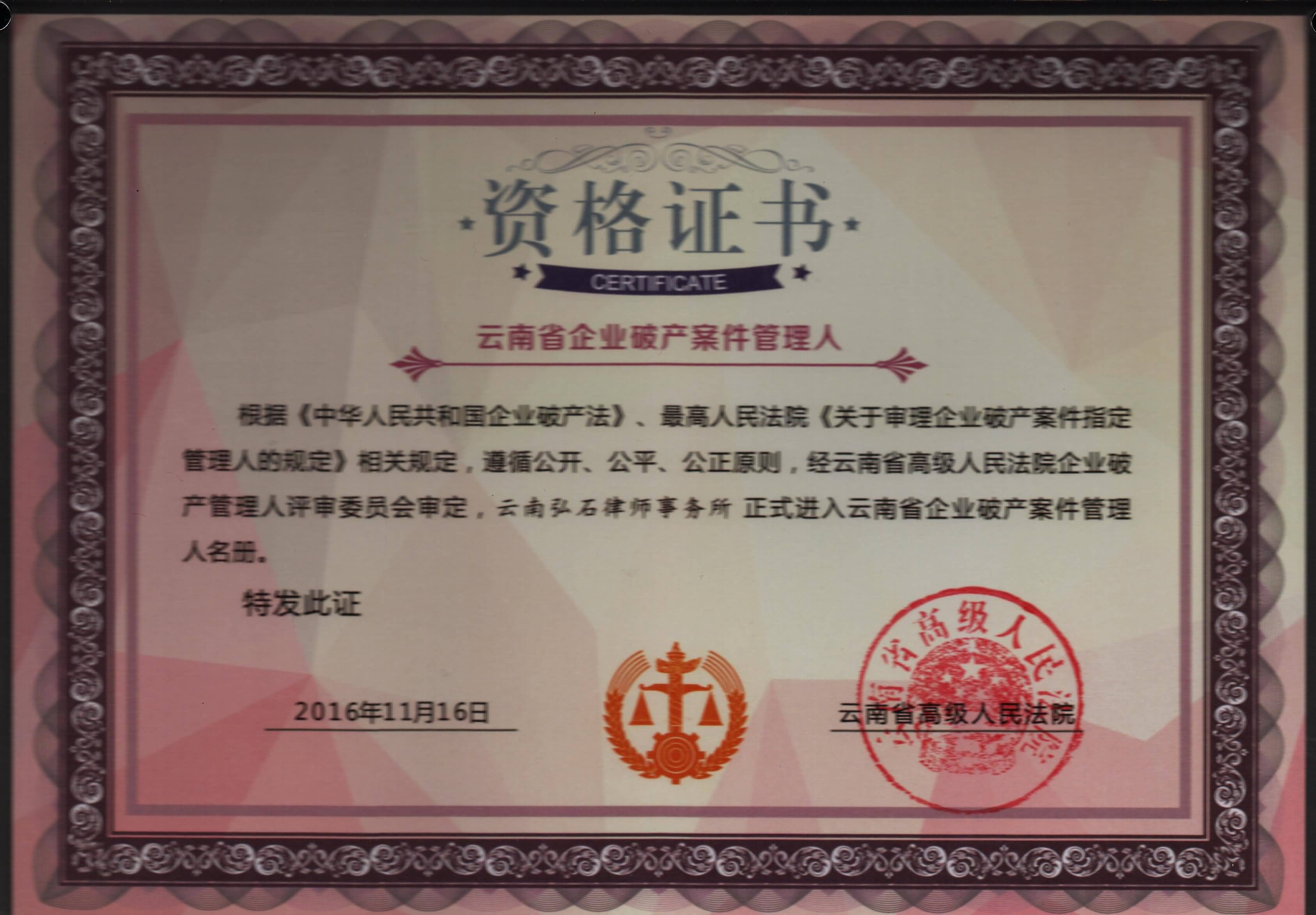 2016年11月16日,经云南省高级人民法院企业破产管理人评审委员会审定,我所被选定进入云南省企业破产案件管理人名册,今后我所将继续秉承“勤勉、诚信、尽责、高效”的理念为每一位当事人提供更高品质的服务。