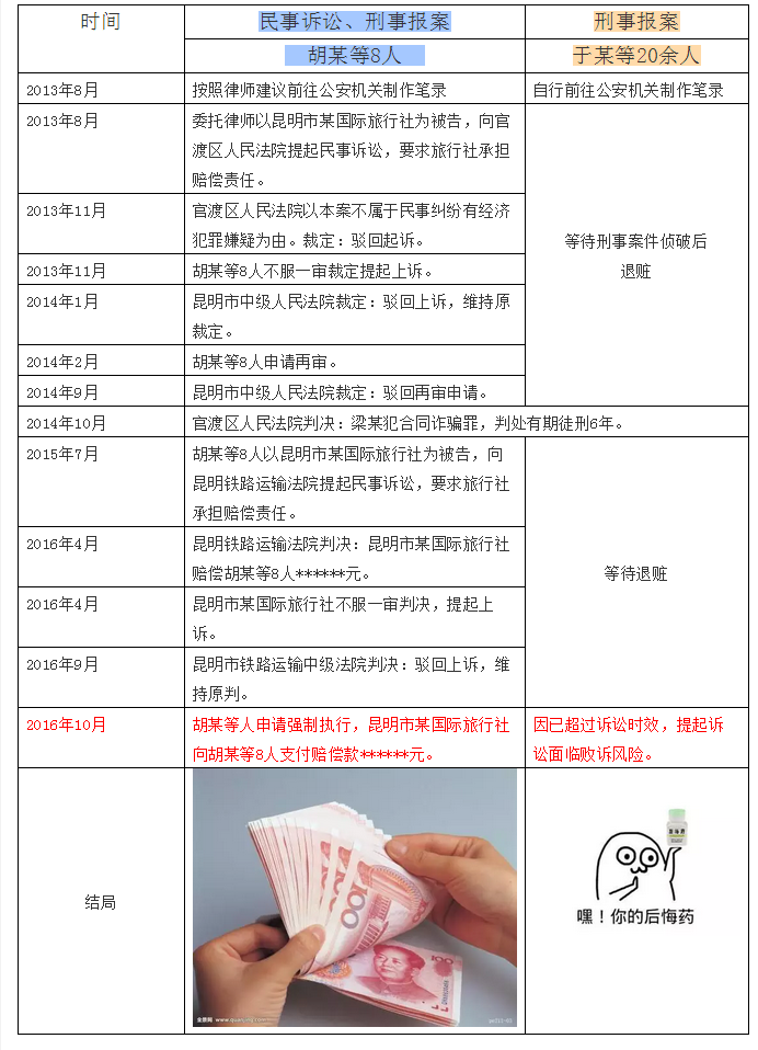 胡某、于某等三十余人来到旅行社投诉。才得知旅行社已经向公安机关报案。