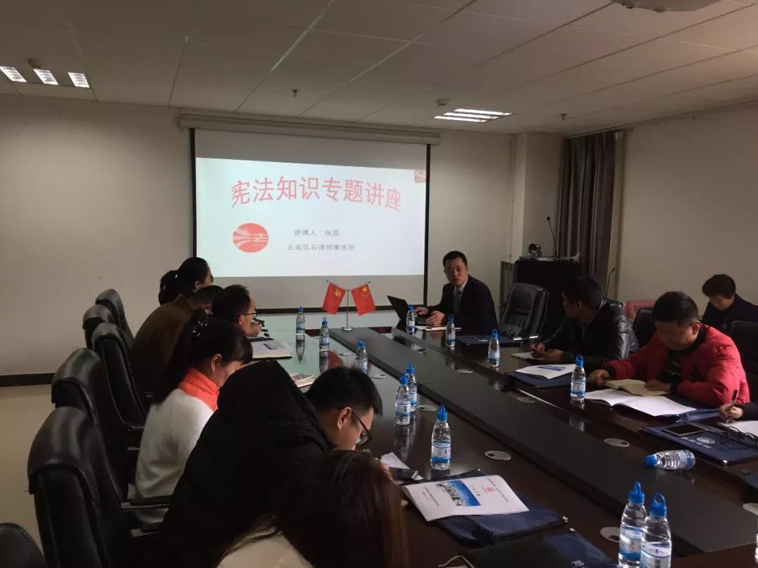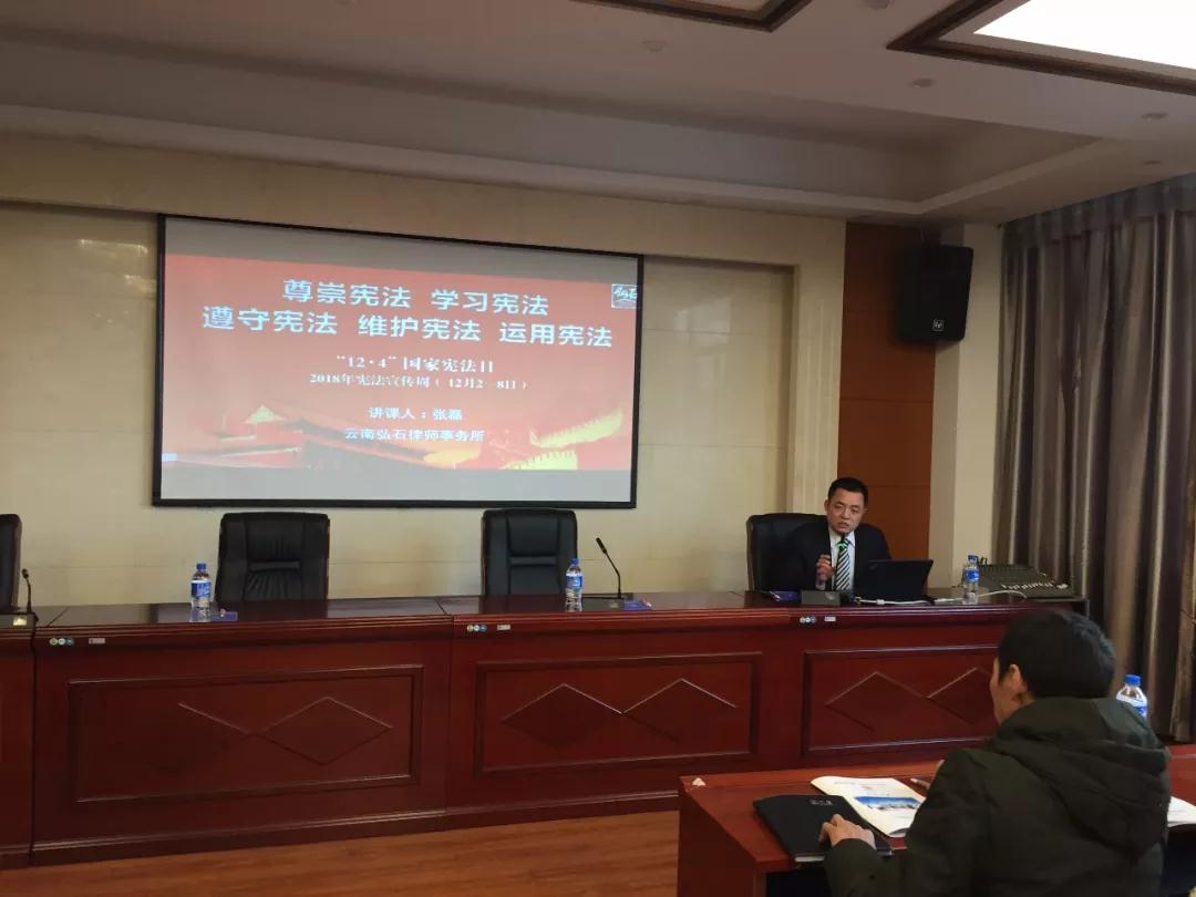 2018年12月7日上午,张磊律师为昆明市阳宗海管委会的机关工作人员进行了《宪法》的专题知识讲座,张磊律师针对行政机关的性质,主要从“为什么设立宪法日”、“宪法的地位”、“我国宪法的发展历程”、“宪法为什么要进行修改及修改的意义”等方面,结合第五个“国家宪法日”的主题进行了专题知识的宣讲。