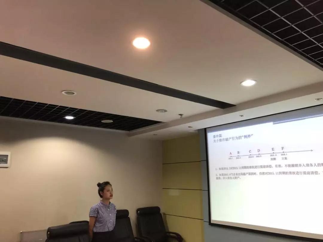 首先,实习律师杨丹向参会人员细致地讲解了破产业务方面的法律法规司法解释,并结合实际案例分别从破产原因、破产申请、债务人财产、破产债权申报、债权人会议以及破产重整、和解、清算三种程序等方面分享破产实务知识。通过讲解,进一步巩固、加强了大家对破产业务的知识储备,为本所更好的提供法律服务奠定了坚实的基础。