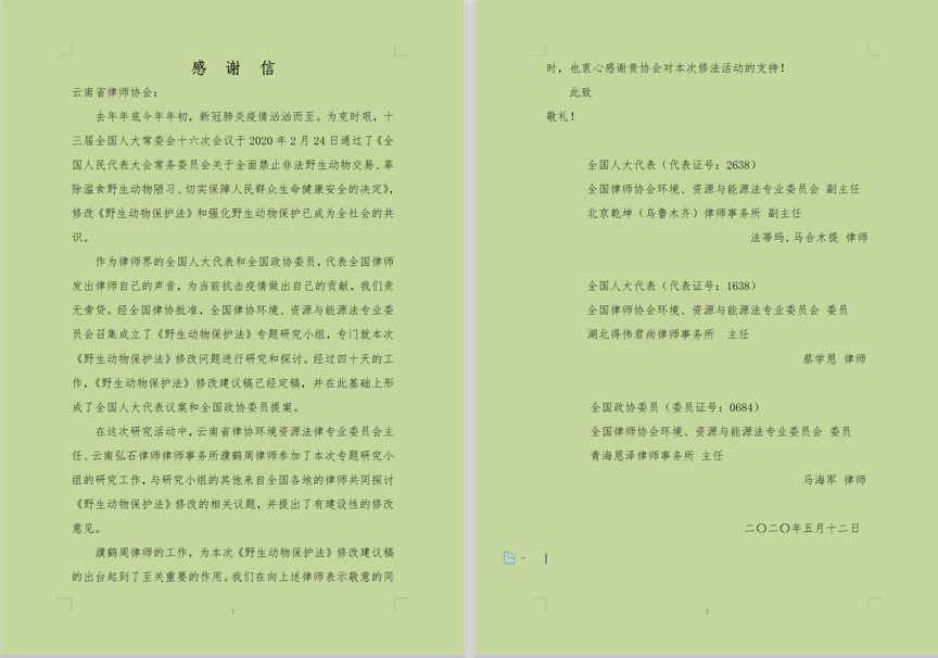 为在抗击疫情工作中尽自己的一份力,我所濮鹤周主任作为云南省律协生态文明和环境资源业务研究委员会主任,积极报名参加了相关专题研究,并迅速在事务所内成立了课题研究小组,开展起草野生动物保护法修改建议的专项工作。课题小组群策群力,有的放矢地对本次野保法修改提出了建议,包括设立国家野生动物保护日,将野生动物保护及革除滥食野生动物陋习纳入城乡社区公共文化服务体系建设,确立野生动物保护相关民事和行政公益诉讼制度等。近期,全国律协环资委向云南省律师协会和濮鹤周发来了感谢信。