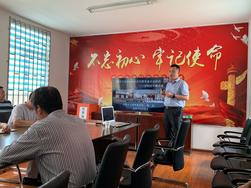 为响应“昆明市2020年法治宣传教育进企业活动”的号召,2020年6月23日14时,我所党支部书记张磊律师受邀来到云南省有色地质局综合经营公司开展“昆明市2020年法治宣传教育进企业” 合同法专题讲座,单位领导及员工20余人现场参与了本次讲座。