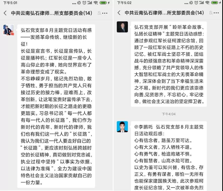 活动结束后,各位党员在工作群中,均踊跃发表本次主题党日的活动感想和心得体会,使得长征精神越发深入人心,全心全意为人民服务的根本宗旨及“弘扬法治·坚若磐石”的法治信念更加坚定。本次主题党日活动取得了圆满的成功。