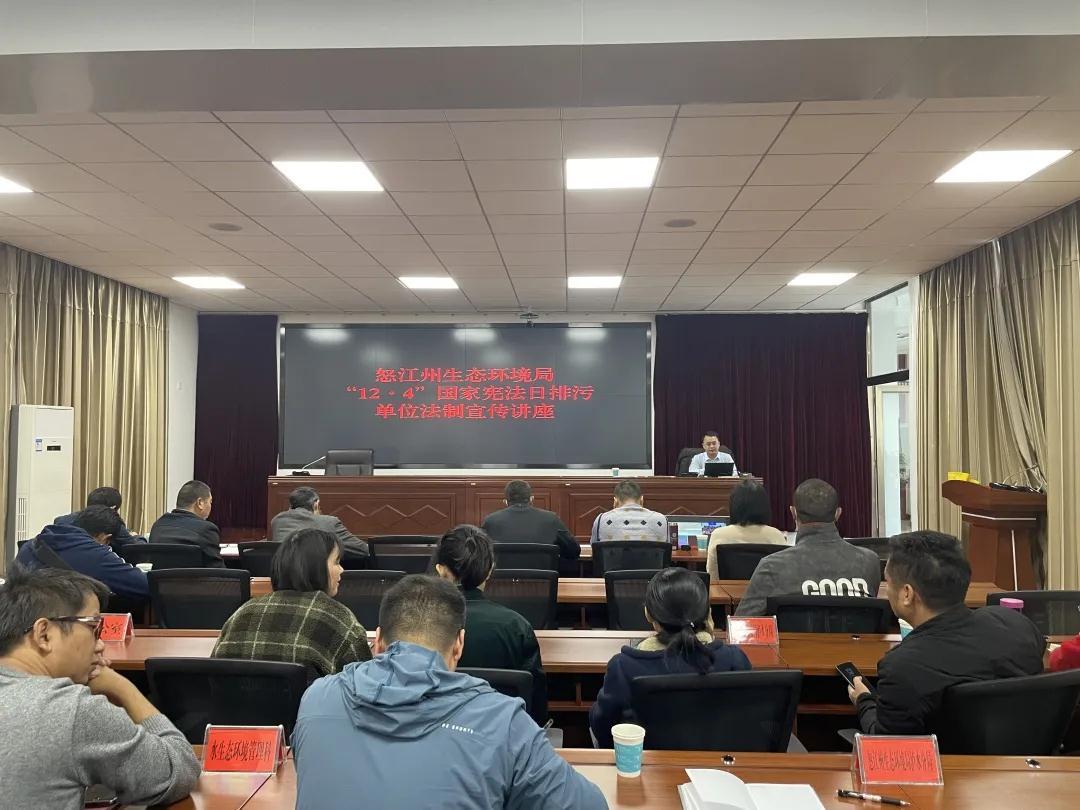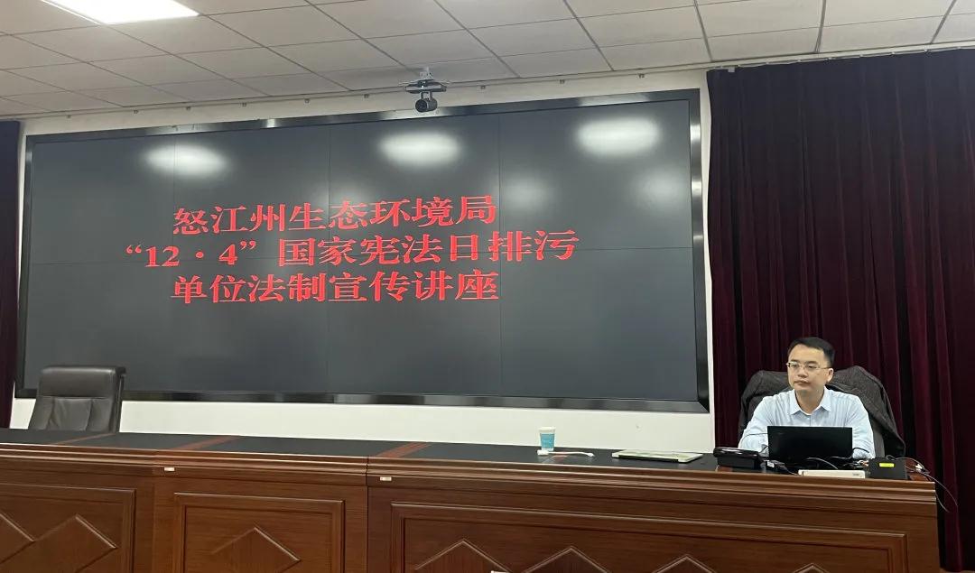 今年的12月4日是第八个国家宪法日,为切实做好法律法规学习宣传,加大普法力度,怒江州生态环境局于2021年12月4日组织举办生态环境保护法制宣传专题讲座,邀请云南弘石律师事务所杨正坤律师进行授课。怒江州生态环境系统有关工作人员、全州重点排污单位、省级联合执法移交的涉嫌环境违法企事业单位、未完成排污许可证限期整改的企事业单位有关负责人参加了培训。本次讲座以现场与视频相结合的方式进行,主会场设于州生态环境局6楼视频会议室,福贡、贡山、兰坪设分会场,当地企业通过视频连线参加培训,取得了较好的宣传效果。