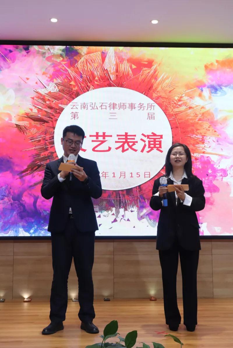2022年1月15日下午,云南弘石律师事务所2021年度总结会暨表彰大会在方舟大酒店举行,全所同仁参会。本次会议由杨鹏律师、陈春梅实习律师担任主持人,共分为六项议程。