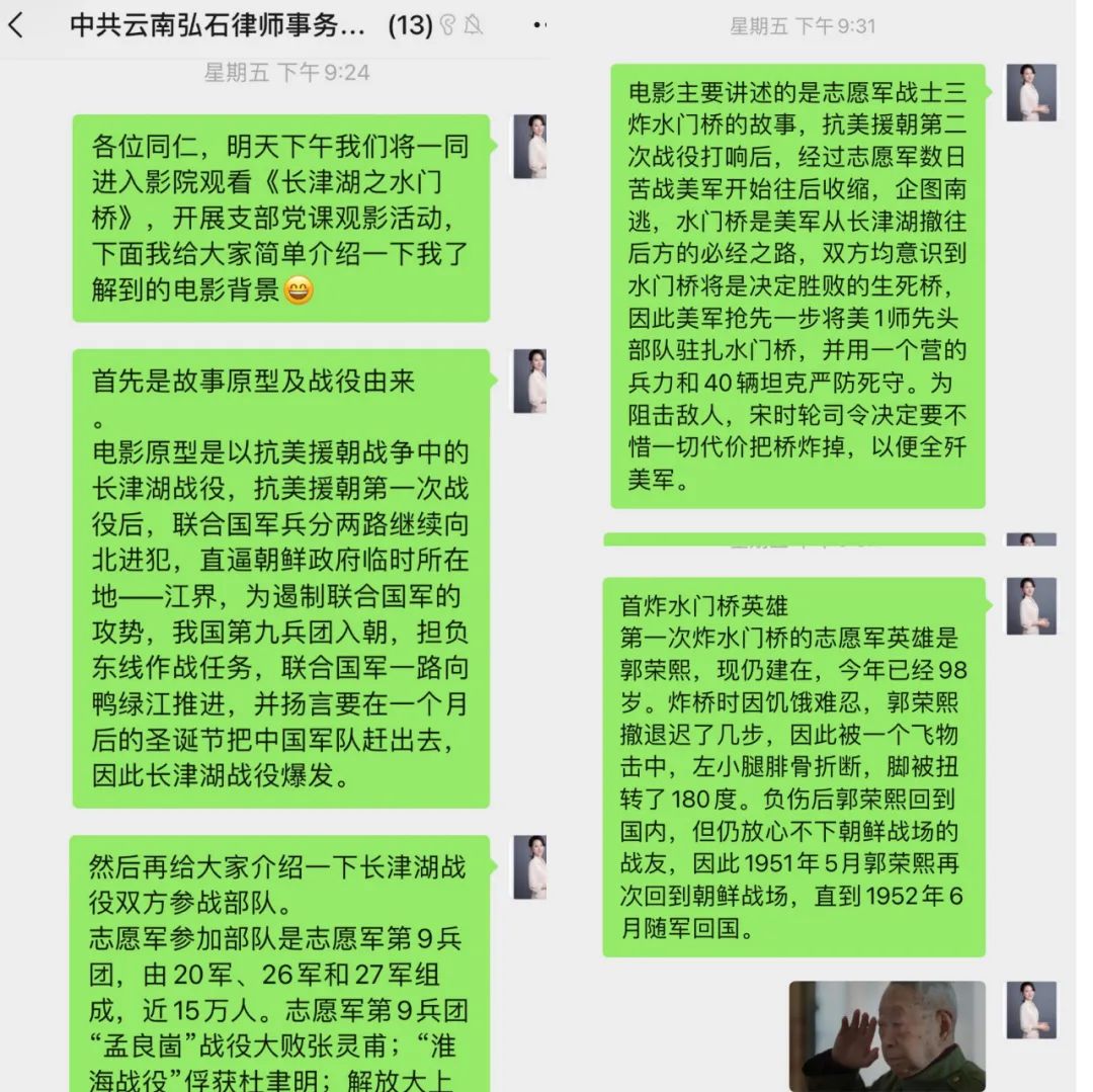 为进一步扩大和提升爱国主义教育党课活动的影响力,不断将爱国主义教育精神深入党员心中,党课观影活动开展前一天,组织人员在我所党支部微信群中向党员同志介绍了本次所观看电影的背景情况,内容涉及电影所描述的故事原型、战役由来、电影主要内容、电影所述炸桥任务细节及首炸水门桥英雄事迹等。