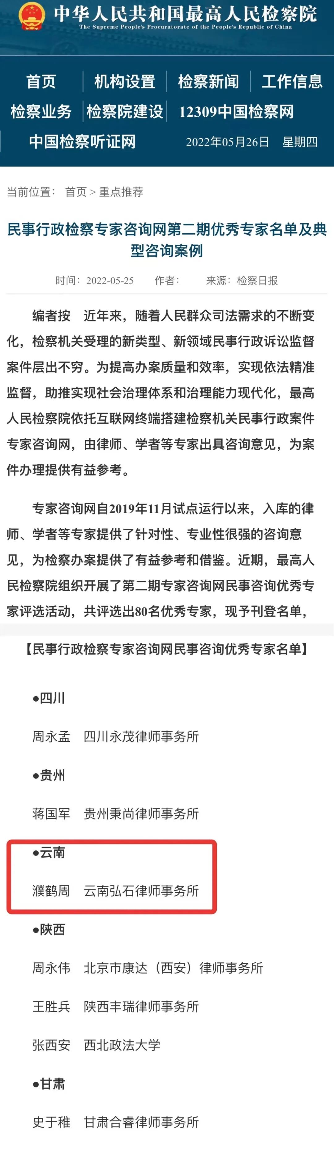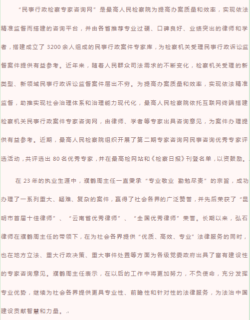 弘石荣誉/我所濮鹤周律师获评最高检第二期民事行政检察专家咨询网“民事咨询优秀专家”荣誉称号