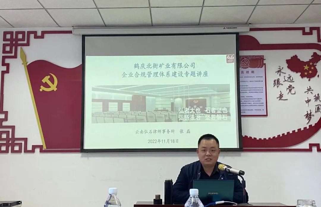 为深入贯彻习近平法治思想,深化法治国企建设,切实防控风险,我所常年法律顾问单位鹤庆北衙矿业有限公司,邀请本所张磊律师于2022年11月18日上午,为公司开展了《企业合规管理体系建设专题讲座》,公司领导及中层管理干部参加了此次培训。